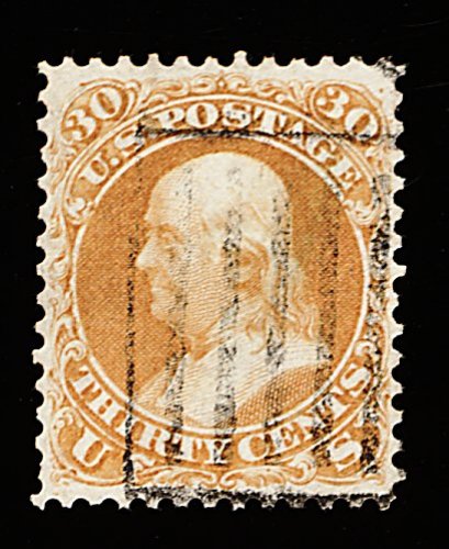 142 O 71 image#71, 30c Orange, an extraordinary used example, that is not only in gem quality, but it is also wonderfully cancelled by a superb strike of a scarce fancy "prison bars" cancel of Columbus, Ohio (S-E #SD-G102), stamp features absolutely perfect centering which is almost unheard of on this value, plus its margins are wider than typically encountered, deep luxuriant color and impression on particularly clean paper, outstanding central strike of this most unusual cancellation, an outstanding used gem in every regard; the Scott catalogue notes "values for No. 71 are for copies with small margins, especially at sides. Large-margined examples sell for much more."; 2000 PF certificate. (Image) 150.00+