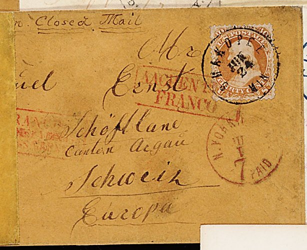 143 c 71 image#71, 30c Orange, an especially choice single which possesses outstanding centering and margins for this notoriously tightly margined stamp, wonderfully tied to orange colored 1865 cover to Switzerland by socked-on-the-nose "Shakopee, Min./Jun 24" c.d.s., stamp also tied by red boxed "Aachen/Franco" handstamp, sent via "Prussian Closed Mail", numerous transit and arrival postmarks, very fine; a handsome Thirty Cent 1861 cover in much nicer condition than typically encountered. (Image) Est. 400-500