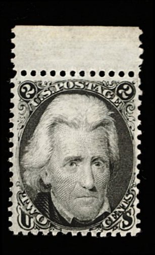 147 nh 73 image#73, 2c Black, a most impressive top sheet-margin mint single that is the epitome of a "post office" fresh gem, as this remarkable stamp features an overall freshness and brilliance few others enjoy, with prooflike color and impression on crisp immaculate paper, incredibly well centered as well, particularly for this notoriously difficult stamp, pristine o.g., never hinged, extremely fine; any mint Two Cent "Black Jack" in this outstanding quality would be exciting, but to find one never hinged is a challenge most collectors do not wish to take on; 2001 PF certificate. (Image) for hinged 350.00
