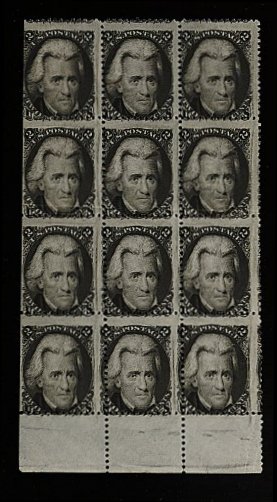 148 og/nhbl 73 image#73, 2c Black, bottom left margin block of twelve (3x4), natural straight-edge at left, strong fresh color, o.g., five stamps n.h., second row with horizontal crease ending in tear at right, bottom right stamp with mild gum creases, fine; an unusually large and scarce multiple; 2001 PSE certificate. (Image) 7,500.00+