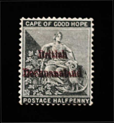 1586 og 4a image#4a, 1885 1/2p Black, with double "British Bechuanaland" overprint in both red and black, a seldom offered mint example, large part o.g., centered a bit to bottom as all examples are found, partially reperforated, fine appearance; 2001 BPA certificate (S.G. #1b; £600). (Image) 850.00
