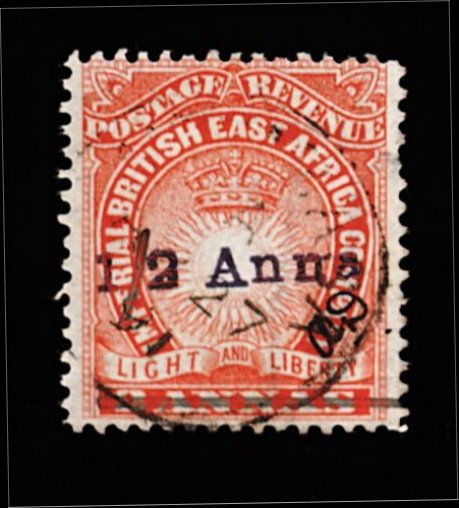 1595 O 31 image#31, 1891 "1/2 Anna" Mombassa provisional handstamped surcharge on 2a Vermilion, initialed "A.B.", a fresh and lightly cancelled example showing part of papermaker's watermark, pulled perf. at right resulting in small thin, otherwise very fine (S.G. #20; £750). (Image) 900.00