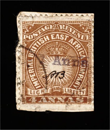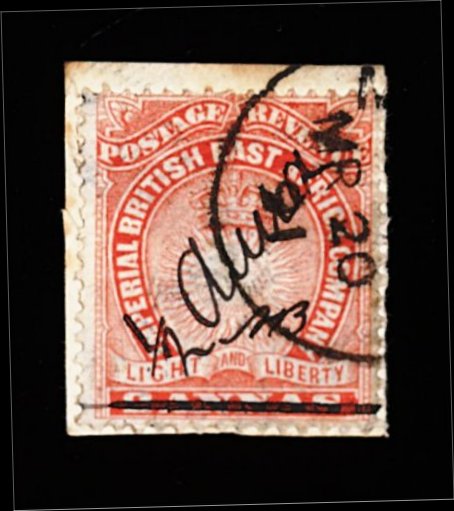 1597 O 33 image#33, 1891 "1/2 Anna" Mombassa provisional manuscript surcharge on 2a Vermilion, initialed "A.B.", bright color, tied to piece by "MR 20 91" c.d.s., very fine; 1999 Brandon certificate (S.G. #23; £750). (Image) 675.00