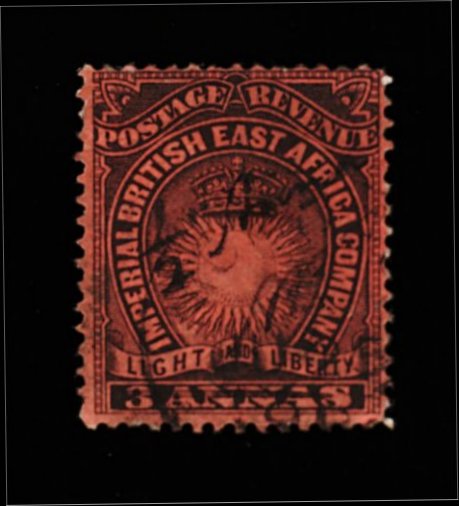 1600 O 34Ac image#34Ac, 1895 "1 anna" Mombassa provisional manuscript surcharge on 3a Black on red, initialed "T.E.C.R." and face value also obliterated, bright color and well centered, with light squared c.d.s., very fine; 1999 Brandon certificate (S.G. #32; £1,800). (Image) 1,500.00