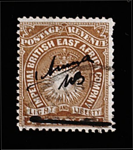1601 O 35 image#35, 1891 "1 Anna" Mombassa provisional manuscript surcharge on 4a Yellow brown, initialed "A.B.", fresh and fairly well centered for this, lightly cancelled, one irregular perf. at top right, very fine (S.G. #26; £1,300). (Image) 950.00
