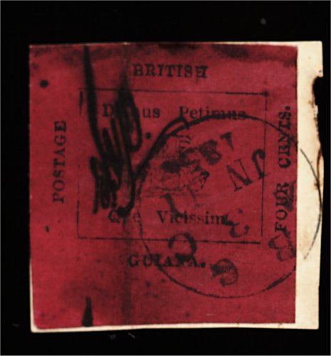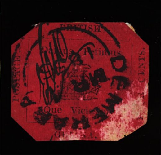 1612 O 14 image#14, 1856 4c Black on magenta, initialed "E.D.W.", cut to shape, bold centrally struck "Demerara/MR 4 1855" double arc d.s., strong bright color, surface abrasions at bottom and lower right corner, light creasing and some backing paper adhesions, nevertheless a highly acceptable "space filler" of this rare classic (S.G. #24; £6,000). (Image) 7,500.00