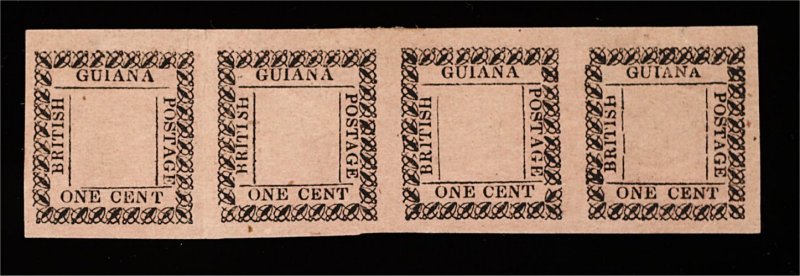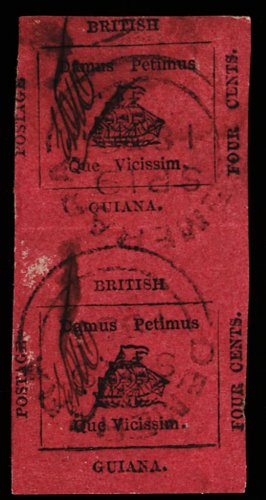 1613 O 14a image#14a, 1856 4c Black on rose carmine, intialled "E.D.W.", a magnificent vertical pair of this famous primitive classic stamp, pos. 3-4, being the only recorded multiple in this color, exceptionally bright and well preserved color especially when one considers the age of the stamp and the climatic conditions to which it was exposed, sharp black printing and neat initials, cancelled by two strikes of the "Demerara/SP 19/1856" double arc d.s., margins range from large to just touching in a couple places, the few usual surface scuffs associated with the delicate surface colored paper, light horizontal crease between the stamps, overall in a very fine state of conservation and of great visual appeal, fine appearance; according to Townsend, there were four different types with the sheet composed of a vertical strip of four (hence the lack of existence of any horizontal pairs); when one considers the relative rarity of the colored papers, the rose carmine paper for which dated cancellations have been documented between Sept.-Nov., 1856, is twice as rare as the preceding magenta surfaced paper, and of the five recorded pairs of the 4 cents this is the only one on rose carmine colored paper; a celebrated showpiece; ex-Ferrary and Townsend (S.G. #25; £17,000+). (Image) 21,000.00+