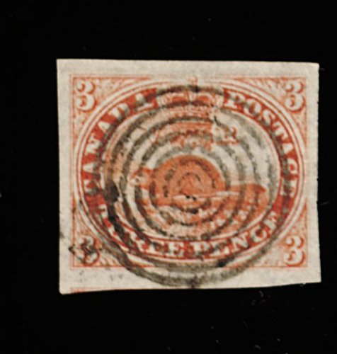 1646 O 1 image#1, 3p Red, an incredibly choice used example of this classic stamp, exhibiting large to enormous margins, showing a portion of the adjoining stamp at bottom, lovely orange red shade with detailed impression on strong and distinct laid paper, wonderfully postmarked by a crisp centrally struck 7-ring target cancel, extremely fine and particularly choice (Unitrade C$1,400.00). (Image) 800.00