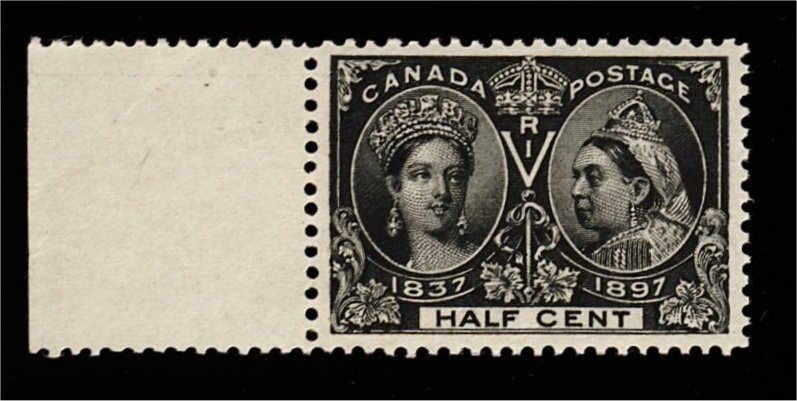 1658 nh 50 image#50, 1897 1/2c Jubilee, left sheet-margin single, exceedingly well centered within large margins, deep intense "jet" black color on fresh white paper, o.g., n.h., extremely fine (Unitrade C$375.00). (Image) 200.00