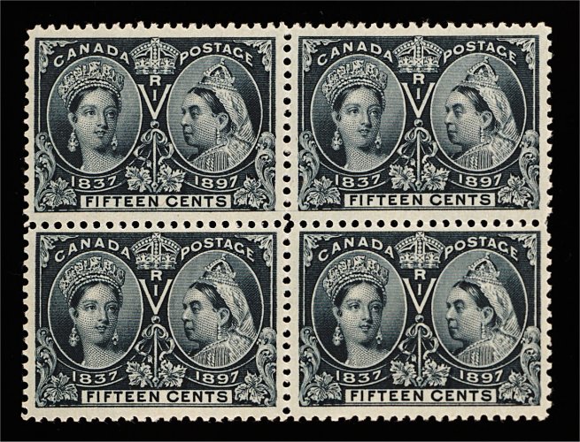 1665 og/nhbl 58 image#58, 1897 15c Jubilee, mint block of four, well centered and margined, especially the top right stamp, deep rich color, o.g., top stamps lightly hinged, bottom stamps n.h., very fine-extremely fine (Unitrade C$2,400.00). (Image) as singles 1,260.00