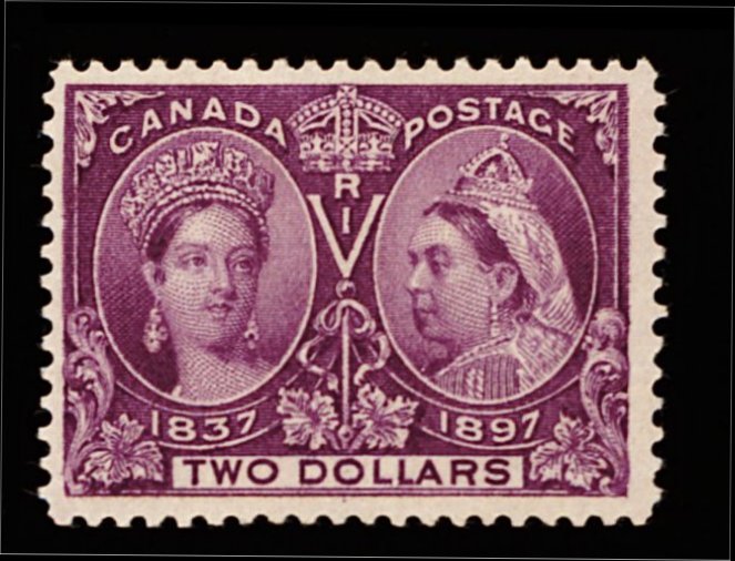 1668 og 62 image#62, 1897 $2.00 Jubilee, lovely mint single, being quite well centered within large margins, vividly rich color, faint trace of a crease at lower left corner, full o.g., lightly hinged, very fine, signed H. Bloch and accompanied by his 1980 Friedl certificate (Unitrade C$1,600.00). (Image) 875.00