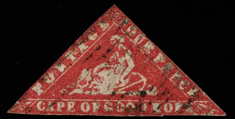 1680 O 5 image#5, 1859 4p Dull rose, a most presentable used example of this famous classic stamp, color still has much of its original intensity, nice clear impression, full to large margins on three sides, irregularly cut at top which may just touch the frame line at one point, cancelled in black with a portion of a red "Paid" h.s. at lower right, fine (S.G. #4; £4,500). (Image) 4,500.00