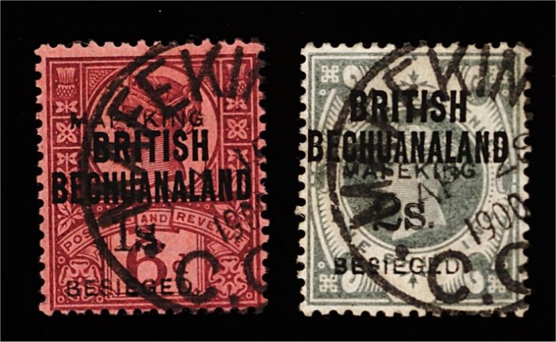 1675 O 176,177 image#176, 177, 1900 1/- on 6p Violet on rose and 2/- on 1/- Green, Mafeking surcharges, both used and very fine; 1995 RPS and 1982 Brandon certificates respectively (S.G. #15-16; £925). (Image) 975.00