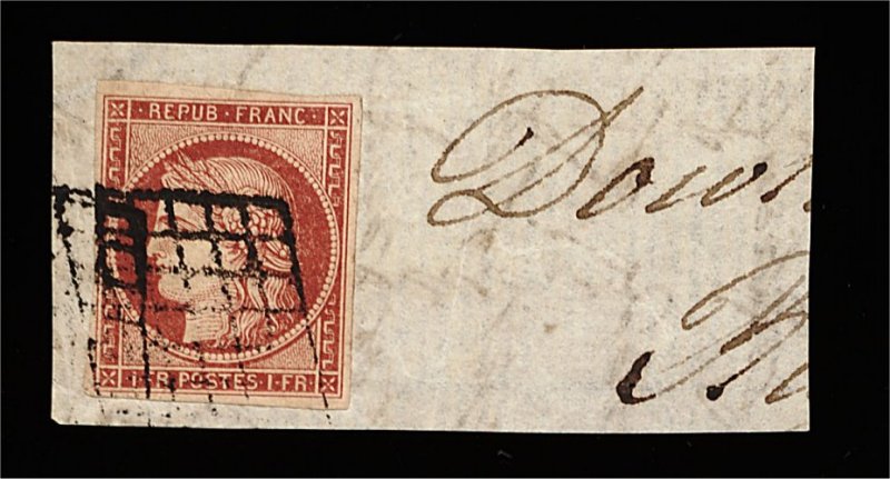 1703 O 9b image#9b, 1849 1Fr Brown carmine, rich distinctive color, large even margins, tied by diamond grill cancel to piece, barely perceptible diagonal crease at lower left, otherwise very fine. (Image) 900.00