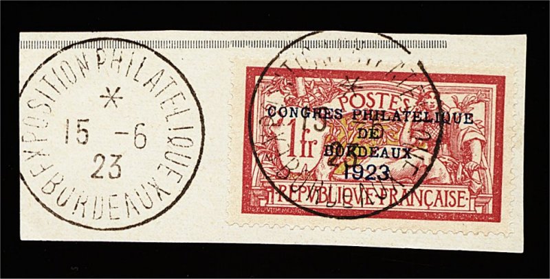 1704 O 197 image#197, 1923 1Fr Bourdeaux Congress, strong colors and perfectly centered, tied to piece by "Exposition Philatelique/Bordeaux" c.d.s., very fine. (Image) 375.00+