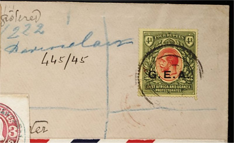 1710 c N117, N118 image#N117, N118, 1917 3R Gray green and violet and 4R Green and red on yellow each tied to separate 1919 registered covers to Switzerland and England respectively, each tied by "Daressalam" double-ring c.d.s., very fine; scarce usages; the former signed Holcombe. (Image) Est. 200-300