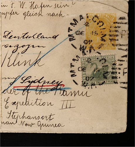 1711 c imageGerman New Guinea forerunner, 1902 (Dec. 15) Western Australia 2p Yellow stationery entire and 1/2p Green (#58), tied by clear strikes of a "Mt. Malcom W.A./Dec 15 02" duplex cancel, addressed to Mr. H. Klink Leader of the Ramu Expedition III, Stephansort, German New Guinea via Sydney, showing "Stephansort/(Apr. 4 03)" c.d.s. receiver to left, cover subsequently returned to Sydney, with "Deutsche Seepost/Neu-/Guinea-/Zweiglinie/(Singapore)" c.d.s. (Apr. 24) as well as Brisbane (Apr. 26) and Sydney (Apr. 28) transits on reverse, light vertical crease and a little roughly opened at top right corner; a remarkable postal history item imbued with character. (Image) Est. 400-500