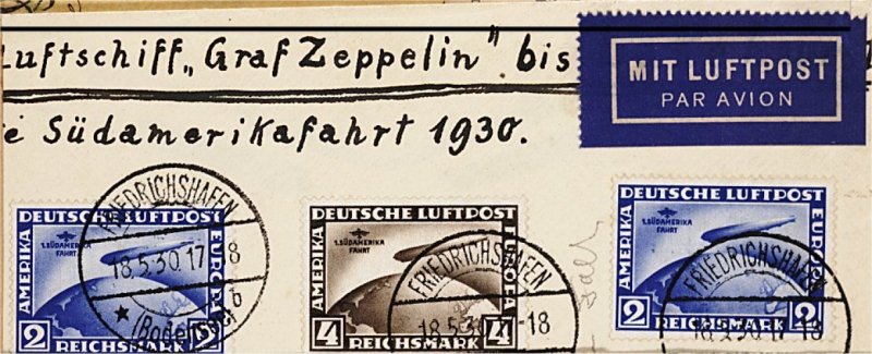 1712 c C38-39 image#C38-39, 1930 2M-4M Graf Zeppelin South America Flight cplt., two 2m and one 4m tied by "Friedrichshafen 18.5.30" c.d.s. pmks. on flown cover, addressed to Beaumont, Texas, proper cachet and backstamp, very fine; signed Falk; accompanied by a second flown cover (9.11.30) with 1928 2M Zeppelin (#C36) tied (Michel #438-39; E1,300). (Image) 1,135.00