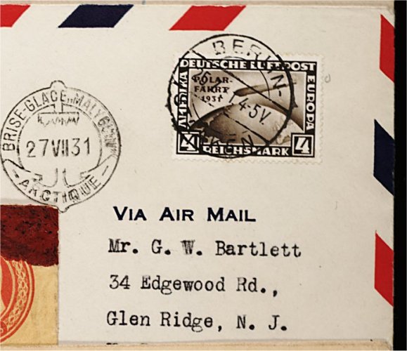 1713 c C41-42 image#C41-42, 1931 2M and 4M Polar Flight Zeppelins, 2M tied to card, 4M tied to cover by "Berlin Staaken 25.7.31" c.d.s. pmks, with "Brise-Glace Malygin Arctique 18 VII 31" pmks. alongside, both addressed to U.S., proper cachets, very fine examples of this scarcer Polar flight (Sieger #119H, Michel #457-58; E1,420) (Image) 925.00