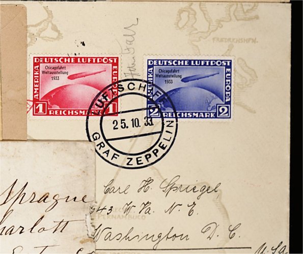 1714 c C43-44 image#C43-44, 1933 1M and 2M "Chicago" Zeppelins, tied to a flown cover with illustrated map by "Luftschiff Graf Zeppelin 25.10.33" c.d.s., sent to Washington, Chicago backstamp, cachet also ties 1M stamp, very fine; signed Falk (Michel #496-97; E800). (Image) 575.00