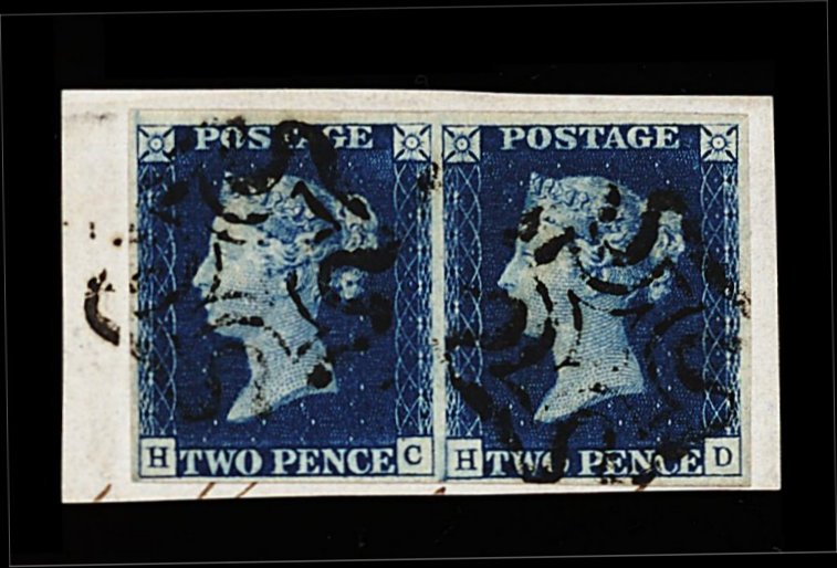 1717 O 2 image#2, 1840 2p Blue, plate 2 pair, lettered HC-HD, intense color, full to large margins, tied to piece by neat Maltese Crosses in black, very fine and handsome (S.G. #5; £800+). (Image) 750.00+