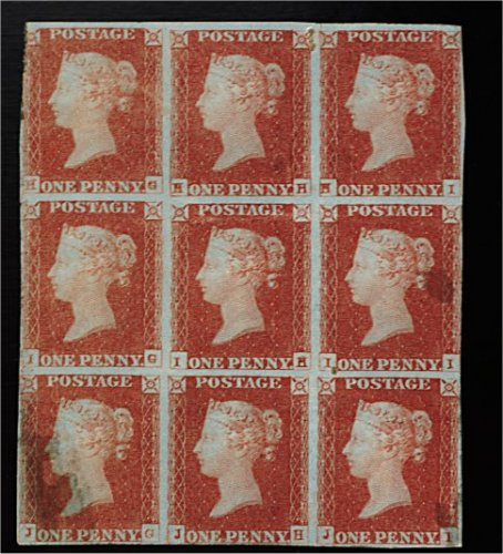 1718 ogbl 3 image#3, 1841 1p Red brown, plate 79, mint block of nine, lettered HG-HI/IG-II/JG-JI, bright reddish color on paper which has retained its strong blueing, large to ample margins except top left stamp just touching at left, nearly full o.g., two light horizontal bends and a few areas of slight translucent staining, otherwise a very fine and scarce multiple (S.G.#8; £1,350+). (Image) 1,260.00+