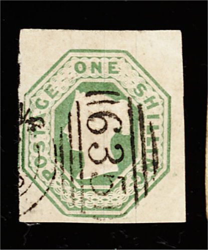 1719 O 5a image#5a, 1847 1/- Pale green, a remarkable used example with large to enormous margins all around, showing portion of adjoining stamp at left, which one hardly ever encounters on these stamps that were so closely printed, sharp embossing, neatly cancelled by "635" duplex, light corner crease in top right margin which is so far away from the design as to be inconsequential, very fine; signed AD(iena), GB(olaffi), and G. Oliva (S.G. #54; £475). (Image) 475.00
