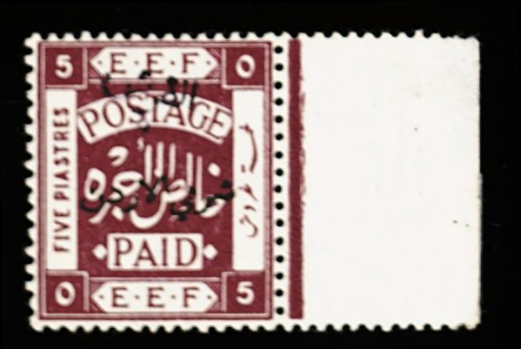1762 og S.G. #26a imageS.G. #26a, 1922 (Nov.) 5Pi on 5Pi Purple, with black surcharge, a magnificent mint right sheet-margin example, gorgeous color and billiantly fresh, o.g., l.h., extremely fine; a great rarity of which less than half a dozen examples are believed to exist; 1955 BPA certificate; ex-Asch (Scott #23 var.). (Image) S.G. £1,500