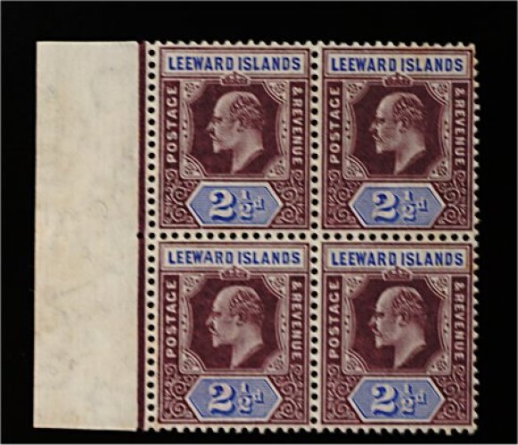 1765 ogbl 32 var image#32 var., 1906 2 1/2p Violet and ultramarine, wide "A" in "LEEWARD" variety, the bottom left stamp in a left sheet-margin block of four, exceptionally well centered, strong colors, o.g., l.h., a couple trivial faint toned spots on gum, one of which barely affects the variety, a very fine exhibition piece (S.G. #32a). (Image) S.G. £594+
