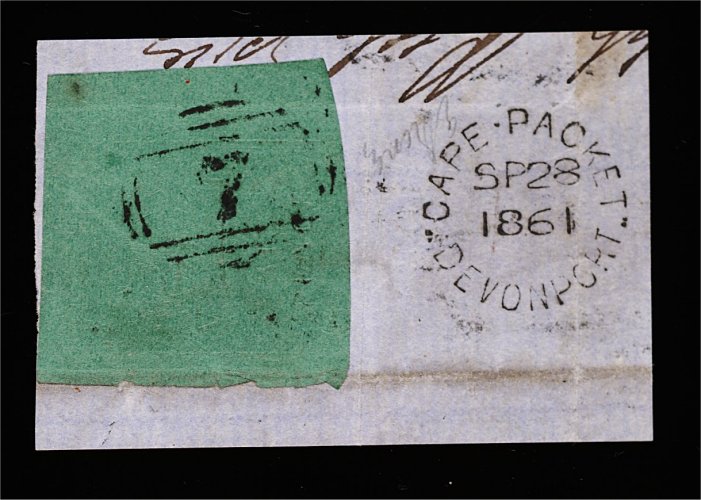 1784 O 2 image#2, 1857 6p Green, embossing still largely clear and visible on bright colored paper, measures approximately 34x32mm with large margins on three sides and possibly touched at bottom, cancelled on piece by "7" in barred obliterator with "Cape Packet/Devonport/SP 28 1861" c.d.s. adjacent, light filing folds cross vertical margins well away from design, a fine example of this extremely difficult embossed classic; signed E(milio) Diena; ex-Amundsen (S.G. #5; £1,100). (Image) 1,200.00
