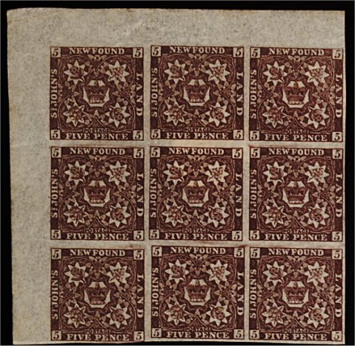 1805 ogbl 12A image#12A, 1860 5p Violet brown, a stunning mint top left corner sheet-margin block of nine, fresh, o.g., usual minor bends and small paper adherence on reverse, very fine (Unitrade C$900.00). (Image) 540.00+