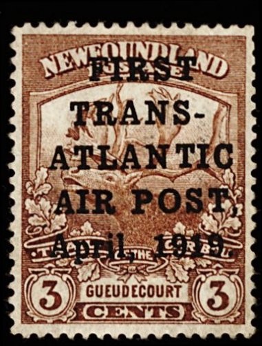 1807 og C1 image#C1, 1919 3c Brown, with "First/Trans-/Atlantic/Air Post/April, 1919." overprint, the so-called "Hawker" air post stamp, a handsome appearing mint example of this air post rarity, possessing the finest centering possible, rich color, with the typical postmaster's "J.A.R." initials on reverse, o.g., lightly hinged, trivial corner crease at top right, certificate also states "slightly soiled" which is completely unworthy of mention, extremely fine appearance; signed Bloch, Kessler, Sanabria, and accompanied by a 2000 BPA certificate (S.G. #142; £15,000). (Image) 15,000.00