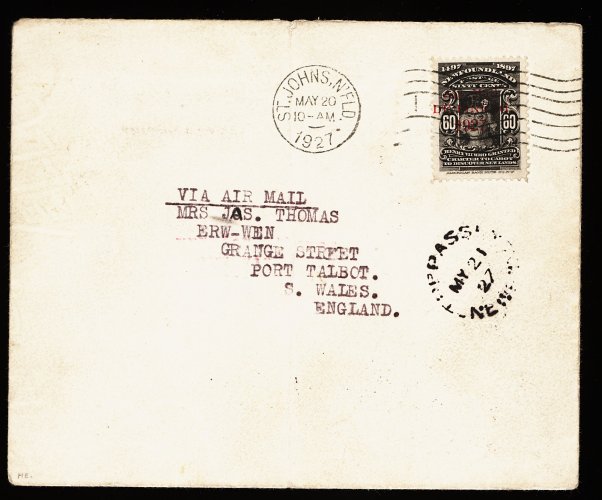 1809 c C4 image#C4, 1927 60c Black, with "Air Mail/De Pinedo/1927" overprint, setting position 50, intense color and wonderfully detailed impression, very well centered, tied by neat "St. Johns, N'fld./May 20 1927" duplex to cover addressed to England, "Trepassy/Newf'nd/MY 21 27" c.d.s. adjacent below and "Roma/Centro" duplex receiver on reverse, the envelope has a vertical crease and is slightly soiled, the stamp is very fine and choice; of the 300 stamps sold, 230 were used on letters, though one does not know how many were soaked off (Unitrade C$25,000.00). (Image) 12,500.00