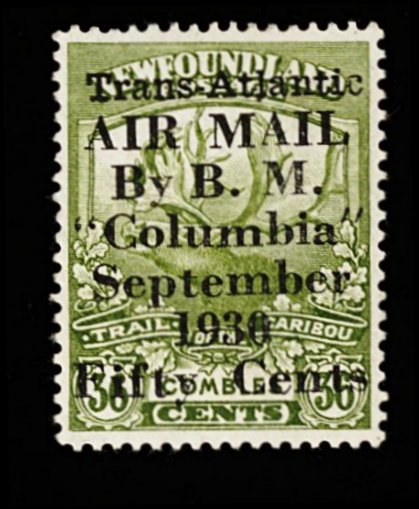 1811 nh C5 image#C5, 1930 50c on 36c Olive green "Columbia" Flight overprint, a marvelous pristine mint example, deep luxuriant color, well centered for this, o.g., n.h, very fine; of the 300 stamps printed, only 200 were retained in mint condition, and never hinged examples are seldom encountered; signed HRH in pencil and accompanied by a 1970 RPS certificate (Unitrade C$18,000.00). (Image) 8,500.00