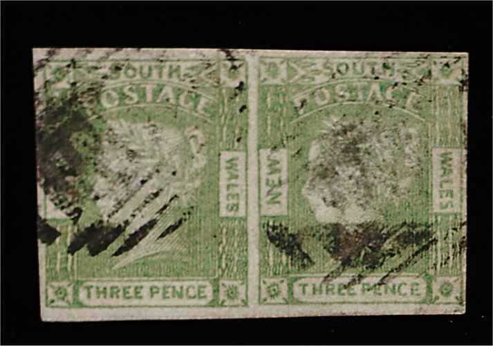1813 O 17a image#17a, 1852 3p Emerald on thick blue wove paper, striking horizontal pair, ample to very large margins all around, lovely rich pastel shade on heavily blued paper, two unobtrusive strikes of an enclosed grid cancel, choice very fine; a lovely multiple; 1982 Friedl certificate (S.G. #69; £400+). (Image) 200.00+