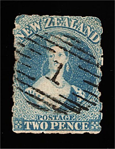 1814 O 12a image#12a, 1860 2p Blue, pin rouletted 9-10 at Nelson, bright pastel shade, remarkable in that it shows the complete rouletting all around which is most unusual, perfect centrally struck "1" in bars cancellation, small corner crease at lower right, otherwise very fine; seldom offered in any condition; clear 2000 BPA certificate (S.G. #19; £3,000). (Image) 2,250.00
