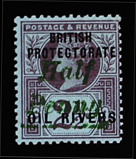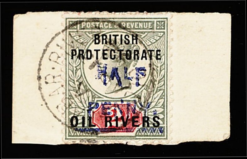 1820 O 15 image#15, 1893 1/2p on 2p Green and carmine, Ty. 9 (S.G.) in blue, well centered, tied to piece by complete strike of "Old Calabar River/AP 11 94" c.d.s., very fine; only 60 examples surcharged in blue were produced (S.G. #30; £600). (Image) 500.00