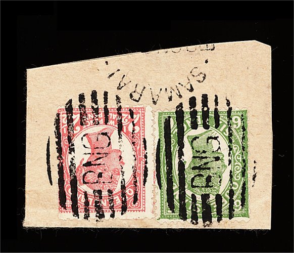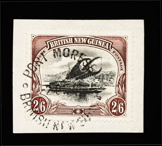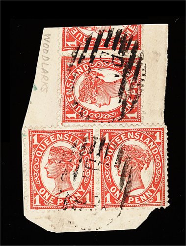 1861 O imageSamarai "B.N.G." nine bar obliterator, two exceptional strikes tying Queensland 1897 2 1/2p Rose and 6p Yellow green on piece and showing part "Samarai/B(ritish New Guinea)" c.d.s. adjacent, extremely fine and choice. (Image) Est. 100-150