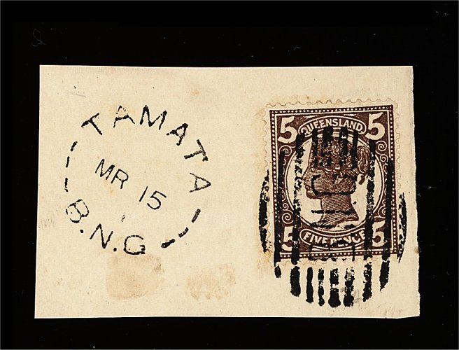 1862 O imageTamata "B.N.G." ten bar obliterator, extremely fine strike tying Queensland 1897 5p Violet brown on piece and showing "Tamata/B.N.G." c.d.s. adjacent, a choice example of this rare cancellation. (Image) Est. 200-300