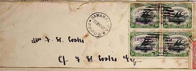 1872 c 1 image#1, 1901 1/2p Yellow green and black block of four, cancelled by two "BNG" nine bar obliterators and violet "Territory of Papua" provisional or control handstamp on cover addressed to New Zealand via Sydney, "Samarai E.D/11 Mar 07/Papua" origin c.d.s. adjacent, the block has a few faults and the cover is rust spotted, fine appearance; a most unusual and rare handstamp denoting the change of name of the Colony and used during the overprint period, just prior to the newly inscribed Lakatoi issue. (Image) Est. 200-300
