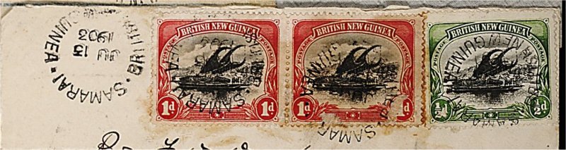 1873 c 1,2 image#1, 2, 1901 1/2p Yellow green and black and 1p Carmine and black pair, each tied or cancelled by a "Samarai/Ju 13 1903/British New Guinea" c.d.s. to cover addressed to England, redirected internally, via Cooktown and Brisbane, gum toning and surface abrasions, still a fine and desirable commercial franking. (Image) Est. 150-200