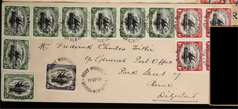 1874 c 1-3 image#1-3, 1901 1/2p Yellow green and black, 1p Carmine and black, 2p Violet and black, irregular strip of seven of the 1/2p, block of four of 1p and single 2p tied on 1906 O.H.M.S. cover (230x110 mm) to Switzerland by unframed "Port Moresby/British New Guinea" c.d.s., one 1/2p is defective, very fine; a colorful four times rate franking. (Image) Est. 500-600