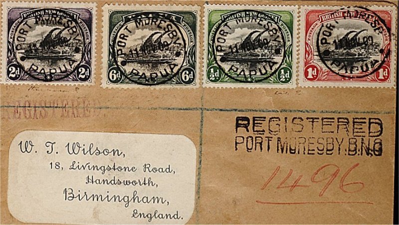 1875 c 1,2,21,39 image#1, 2, 21, 39, 1901 1/2p, 1p, 1907 2p with "Papua" overprint in small type and 1909 6p, all cancelled by choice socked-on-the-nose "Port Moresby/11 Nov 09/Papua" c.d.s. pmks. on registered "Wilson" cover to England, unframed "Registered/Port Moresby, B.N.G." h.s. adjacent, the 6p has a faint crease, a very fine and handsome mixed issue franking. (Image) Est. 200-300