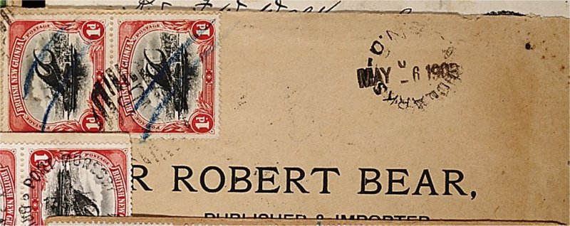 1876 c 2 image#2, 1901 1p Carmine and black, vertical pair tied by multiple strikes of a "BNG" ten bar obliterator and manuscript blue crayon strokes to cover addressed to Sydney, N.S.W. via Samarai and Cooktown, showing "Woodlarks/B.N.G." unframed c.d.s. adjacent, very fine and rare; an exceptional town usage. (Image) Est. 500-750