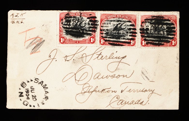 1877 c 2 image#2, 1901 1p Carmine and black, three singles cancelled by centrally struck "BNG" nine bar obliterator on cover to Dawson, Yukon Territory, Canada via Cooktown, Queensland, and Vancouver, unframed "Samarai/B.N.G." c.d.s. adjacent, manuscript crayon "T 2d" crossed out, the cover is opened out for display and small part of arrival c.d.s. missing due to removal of paper seal, still very fine and rare; a remarkable destination and spectacular Gold Rush cover. (Image) Est. 750-1,000