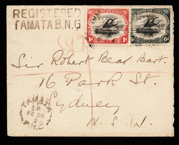 1878 c 2,6 image#2, 6, 1901 1p Carmine and black and 6p Dark green and black, overlapped singles tied by multiple partial strikes of a "Samarai/ MR 3 1902/British New Guinea" transit c.d.s. to registered cover, addressed to Sir Robert Bear Bart, Sydney, N.S.W., unframed "Tamata/FE 02 02/B.N.G." origin c.d.s. at lower left with "Registered/Tamata B.N.G." h.s. adjacent stamps, the cover also has a complete "Mambare/British New Guinea" red wax seal with central crown on reverse, very fine and an extremely rare usage; one of the great first issue covers of Papua New Guinea from both a cancellation and postal history aspect, a fabulous exhibition item. (Image) Est. 5,000-7,500