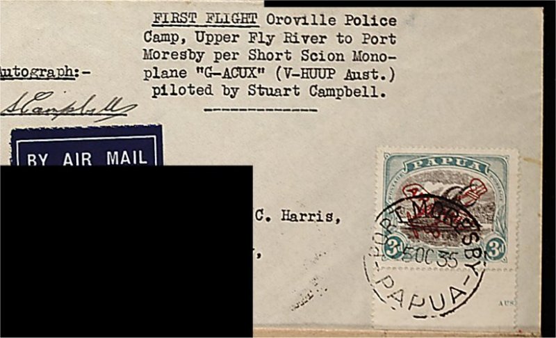 1921 c C2 imageAAMC #20, November 4/9, 1935 Port Moresby to Oroville Police Camp seaplane first flight cover, franked with 1930 3p Blue green and black (#C2), tied by 1935 Port Moresby c.d.s., Oroville arrival c.d.s. on reverse, signed by the pilot S. Campbell as well as by the dispatch officer Cecil F. Cowley, very fine; only 89 covers were flown. (Image) Est. 150-200