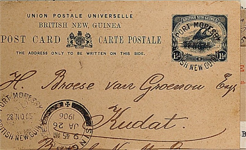 1924 c image1 1/2p Blue UPU postal card used from Port Moresby to Kudat, North Borneo via Singapore, cancelled by unframed "Port Moresby/28 Nov 05" c.d.s., a rare destination and commercial usage. (Image) Est. 150-200