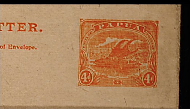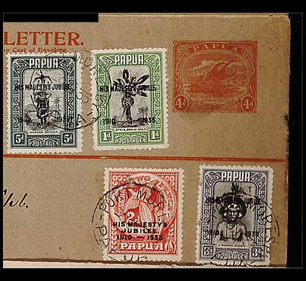 1927 c image4p Orange registered stamped envelope, size H2, additionally franked with the 1935 Silver Jubilee set (#114-17), tied by a "Port Moresby/9 Jul 35/Papua" c.d.s. to cover on the first day of issue of this popular set, addressed to the U.S. via Sydney, a fine and scarce use of postal stationery despite its philatelic nature. (Image) Est. 150-200