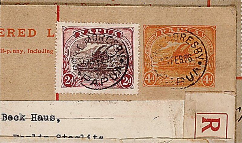 1926 c image4p Orange registered stamped envelope, size G, used in combination with a Lakatoi 2p Red violet and violet brown (#63), both cancelled by a "Port Moresby/23 Feb 26/Papua" c.d.s. on uprated cover to Berlin via Sydney, violet "Treasury" departmental h.s. and registration label adjacent, very fine; a rare card commercially used. (Image) Est. 150-200